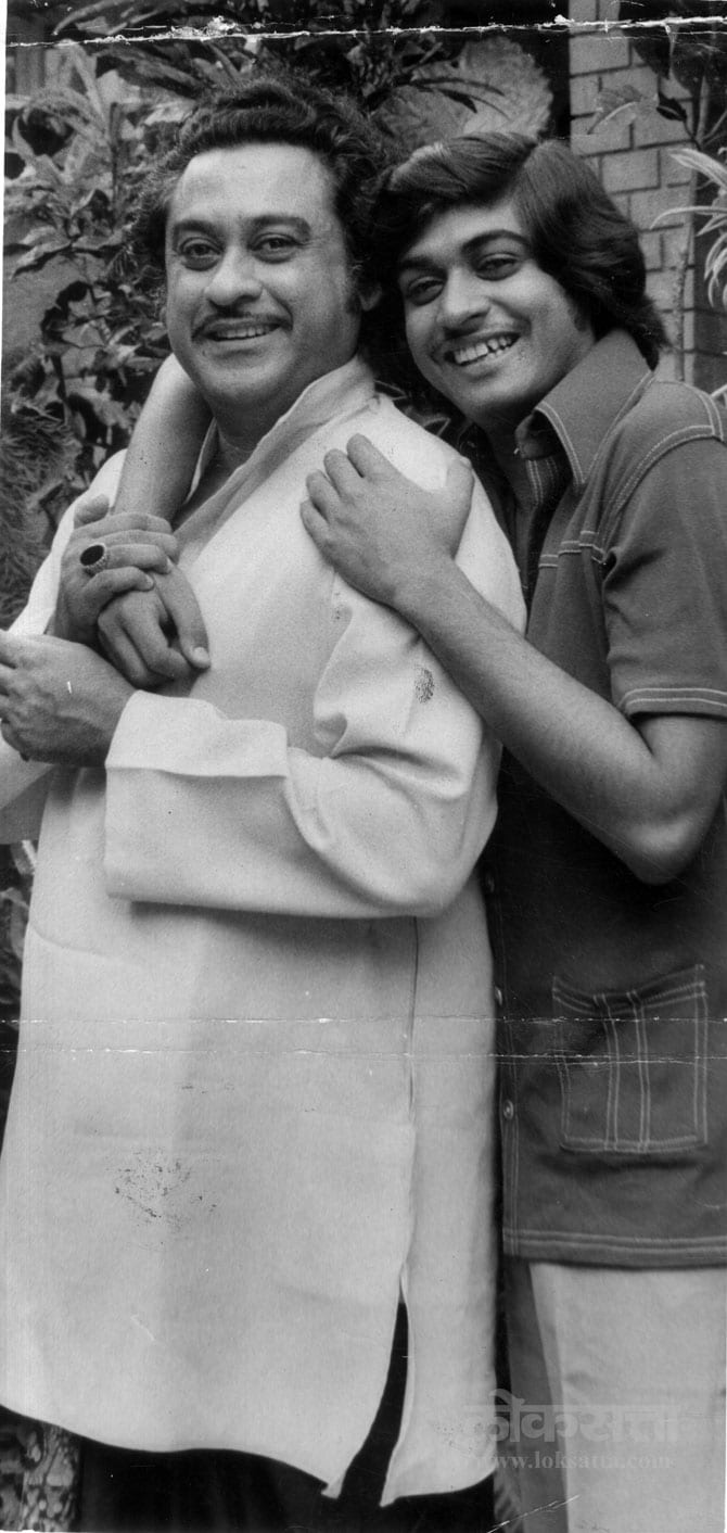 किशोर कुमार यांनी हिंदी गाण्यासोबत तमिळ, मराठी, आसामी, गुजराती, कन्नड, भोजपुरी, मल्ल्याळम, उडिसी या भाषांमध्येही गाणी गायली आहेत. त्यांना आठ वेळा फ़िल्मफेअर सर्वोत्तम पार्श्वगायकाचा पुरस्काराचा मान मिळाला आहे. या छायाचित्रात मुलगा अमित कुमारच्या गाण्यावर किशोरजींनी ठेका घेतलेला दिसतोय.
