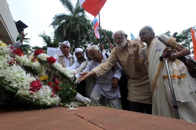 ऑगस्ट क्रांती दिनानिमित्त रविवारी ऑगस्ट क्रांती मैदानावर स्वातंत्र्यसैनिकांनी स्मृती जागविल्या. (छायाः गणेश शिर्सेकर)