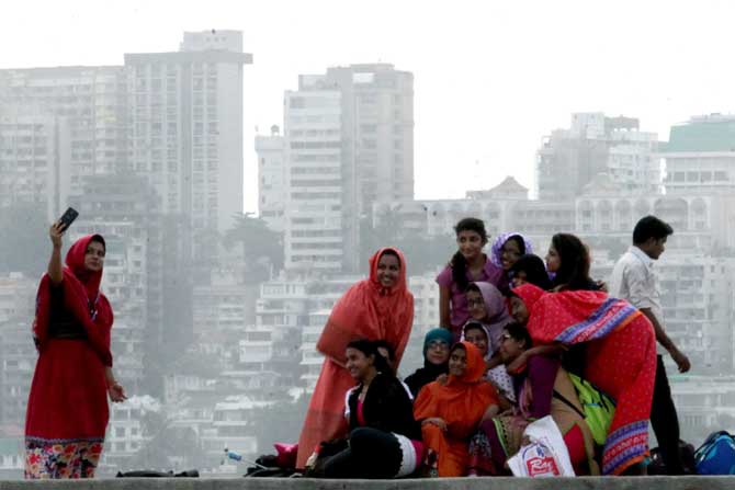 मरीन ड्राइव्हचा कट्टा हा फोटो काढण्यासाठी मुंबईकरांची आवडती जागा आहे. या कट्ट्यावर सेल्फी काढण्याचा आनंद घेताना मुली. (छायाः वसंत प्रभू) -