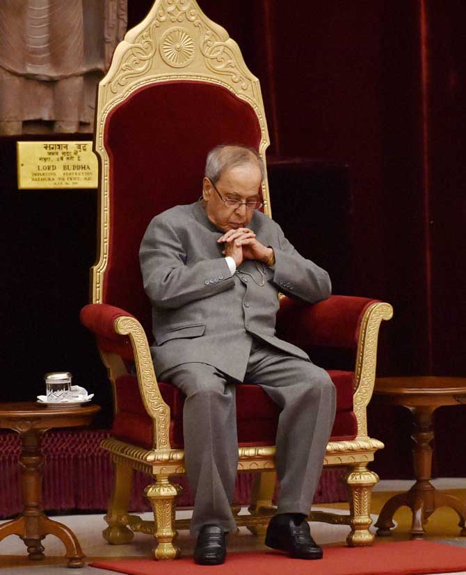 राष्ट्रपती भवनात एका कार्यक्रमादरम्यान विचारमग्न अवस्थेत बसलेले भारताचे राष्ट्रपती प्रणब मुखर्जी. (छायाः पीटीआय)