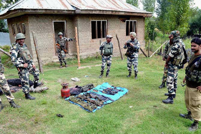 उत्तर काश्मीरमधील हंडवाडा जिल्ह्यात सुरक्षा दलांनी रविवारी चकमकीत तीन दहशतवाद्यांना ठार केले. त्यावेळी मोठ्या प्रमाणात शस्त्रसाठा जप्त करण्यात आला. (छायाः पीटीआय)