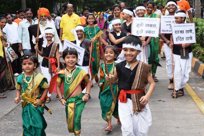 ठाण्यात काढण्यात आलेल्या वर्षा रॅलीद्वारे या चिमुरड्यांनी नागरिकांना ‘स्वच्छ ठाणे, हरित ठाणे’चा संदेश दिला. (छायाः दीपक जोशी)