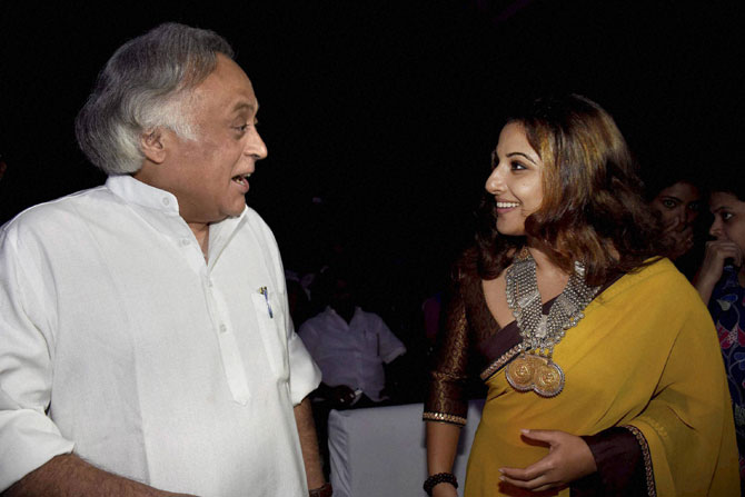 काँग्रेसचे खासदार जयराम रमेश आणि विद्या बालन यांची स्वच्छ बनेगा इंडिया या कार्यक्रमादरम्यान भेट झाली असताना दोघे संवाद साधताना. – (छाया-पीटीआय) -