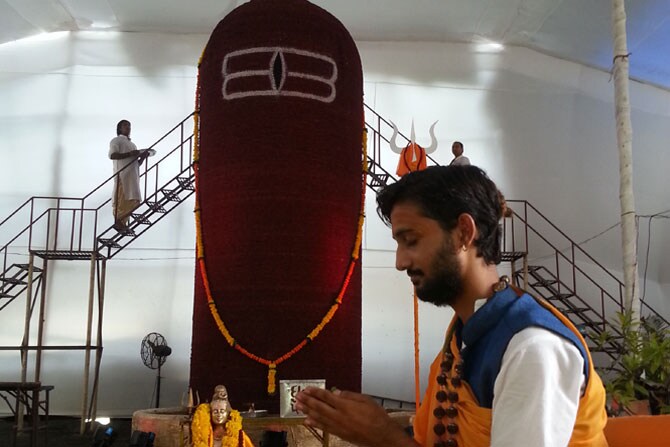 दोन लाख रुद्राक्षांनी बनवलेल्या १८ फूट उंच शिवलिंगाची पुजा करताना भाविक (छाया-पीटीआय)