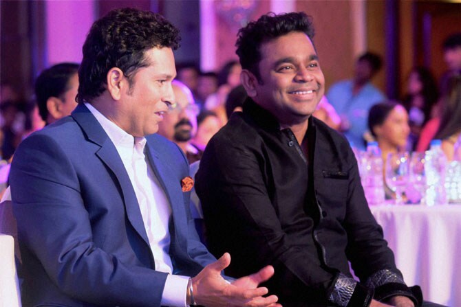 ‘मदर्स ऑफ इंडिया २०१५’ या पुरस्कार सोहळ्यादरम्यान भारताचा माजी क्रिकेटपटू सचिन तेंडुलकर आणि संगीतकार ए.आर.रेहमान. (छायाः पीटीआय)