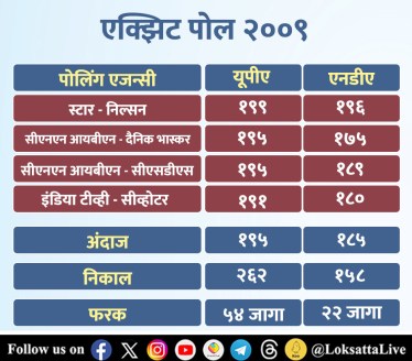 २००९ मध्ये यूपीए पुन्हा सत्तेत आले होते. त्यावेळी सरासरी चार एक्झिट पोलने यूपीएच्या संख्येला कमी लेखले होते. त्यांनी यूपीएला १९५ आणि एनडीएला १८५ जागा मिळतील, असा अंदाज वर्तवला होता. परंतु, त्या निवडणुकीत यूपीएला २६२ जागा, तर एनडीएला १५८ जागा मिळाल्या होत्या. यापैकी काँग्रेसने २०६ जागा आणि भाजपाने ११६ जागा जिंकल्या होत्या.