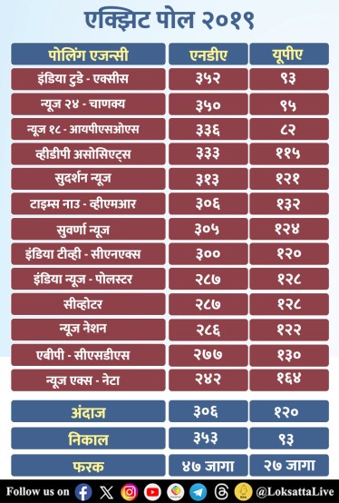२०१९ मध्ये, सरासरी १३ एक्झिट पोलने एनडीएची एकत्रित संख्या ३०६ आणि यूपीएची एकत्रित संख्या १२० असेल, असा अंदाज वर्तवला होता. हादेखील अंदाज अचूक नव्हता. कारण २०१९ च्या निवडणुकीत एनडीएने एकूण ३५३ जागा जिंकल्या, तर यूपीएने ९३ जागा जिंकल्या. त्यापैकी भाजपाला ३०३ आणि काँग्रेसला ५२ जागा मिळाल्या होत्या.