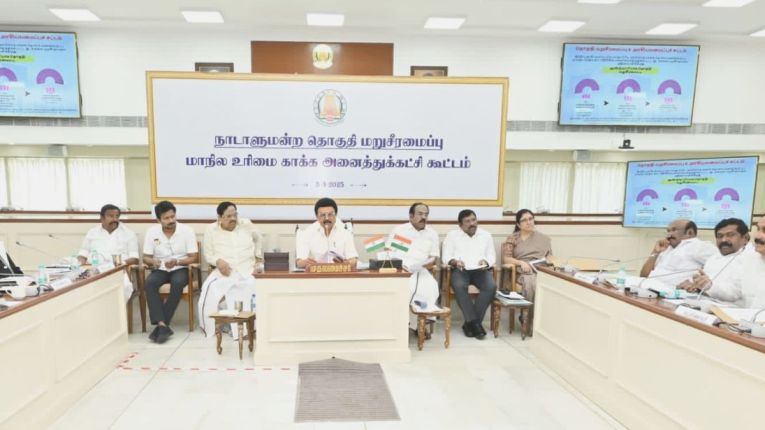 बुधवारी तमिळनाडू सचिवालयात मुख्यमंत्री स्टॅलिन यांच्या अध्यक्षतेखाली झालेल्या सर्वपक्षीय बैठकीत, स्टॅलिन म्हणाले की, “लोकसंख्येच्या आधारावर लोकसभा मतदारसंघ पूर्नरचना करणे भारतीय लोकशाहीत तामिळनाडूच्या राजकीय प्रतिनिधित्वावर थेट हल्ला असेल. दक्षिण भारतावर लोकसभा मतदारसंघांच्या पुर्नरचनेचा चाकू डोक्यावर लटकत आहे, त्यामुळे १९७१ ची जनगणनाच २०५६ पर्यंत मतदारसंघांच्या पुर्नरचनेचा आधार असावा.