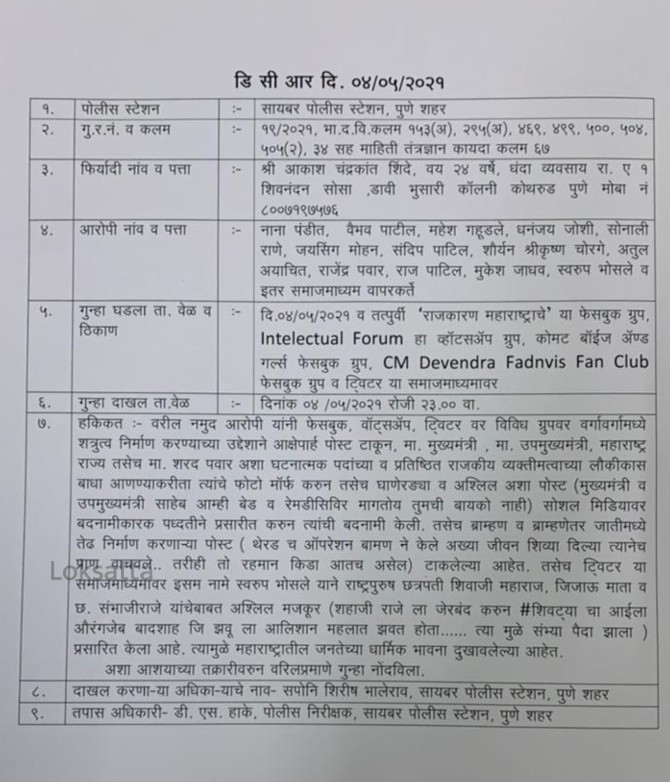 या तक्रारीची दखल घेत नाना पंडीत, वैभव पाटील, महेश गहुडले, धनंजय जोशी, सोनाली राणे, जयसिंग मोहन, संदीप पाटील, शौर्यन चोरगे, अतुल आयचित, राजेंद्र पवार, राज पाटील, मुकेश जाधव, स्वरुप भोसले आणि सोशल मीडिया वापरकर्त्यांविरोधात गुन्हा दाखल करण्यात आला आहे. या प्रकरणाचा तपास सायबर पोलीसचे पोलीस निरीक्षक डी. एस. हाके करत आहेत.