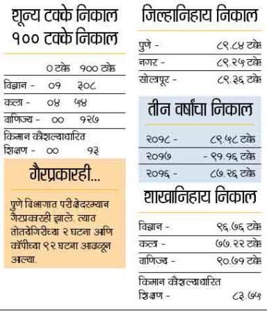 महाराष्ट्र राज्य माध्यमिक व उच्च माध्यमिक शिक्षण मंडळाने बारावीचा निकाल बुधवारी जाहीर केला. पुणे विभागात पुण्यासह सोलापूर आणि नगर जिल्ह्य़ाचा समावेश होतो. या वर्षी पुणे विभागातून २ लाख ३५ हजार ७४७ नियमित विद्यार्थ्यांनी परीक्षेसाठी नोंदणी केली होती. प्रत्यक्ष परीक्षा दिलेल्या २ लाख ३५ हजार ५०२ विद्यार्थ्यांपैकी २ लाख १० हजार ९६३ विद्यार्थी उत्तीर्ण झाले. मागील वर्षी ग्रामीण भागातील विद्यार्थ्यांचे उत्तीर्ण होण्याचे प्रमाण जास्त होते. यंदा मात्र या तिन्ही जिल्ह्य़ांमध्ये विद्यार्थी उत्तीर्ण होण्याचे प्रमाण जवळपास सारखेच आहे. दरवर्षीप्रमाणेच यंदाही मुलांच्या तुलनेत मुलींचे उत्तीर्ण होण्याचे प्रमाण अधिक आहे. विभागातील ८५.९० टक्के मुले आणि ९४.३४ टक्के मुली उत्तीर्ण झाल्या आहेत. विभागातील ९ हजार ०९५ पुनर्परीक्षार्थी विद्यार्थ्यांनी परीक्षा दिली होती. त्यापैकी २ हजार ७९४ विद्यार्थी उत्तीर्ण झाले. पुनर्परीक्षार्थी उत्तीर्ण होण्याचे प्रमाण ३०.७२ टक्के आहे.