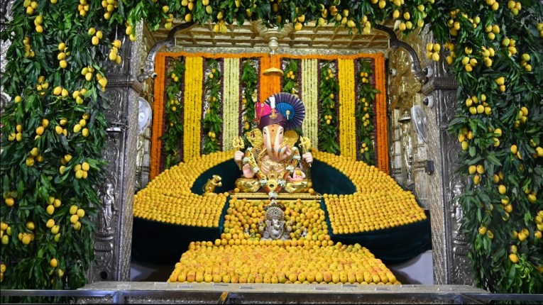 मंदिरात पहाटे प्रसिद्ध गायिका मनीषा निश्चल आणि सहकाऱ्यांनी गायन सेवा अर्पण केली. सूक्त पठण आणि अभिषेक करण्यात आला. आंब्याची आरास पाहण्यासोबतच गणरायाचे दर्शन घेण्यासाठी भाविकांनी पहाटेपासून मोठी गर्दी केली होती.