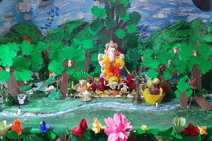 प्रभाकर पवार आणि अमृता पवार या पतीपत्नीने जंगल संवर्धनाचा देखावा सादर केला आहे. त्यांनी तब्बल तीन दिवस यावर काम केलं असून कागदी पुठ्यांपासून हे नैसर्गिक जंगल तयार केलंय. गेल्या काही दिवसांपासून अॅमेझॉन हे जगातील सर्वात मोठं जंगल आगीत होरपळून निघत आहे. कित्येक प्राणी, पक्ष्यांचा मृत्यू या आगीत झाला आहे. त्यामुळे जंगल संवर्धन केलं पाहिजे असा संदेश देण्यासाठी पवार कुटुंबाने हे पाऊल उचलले आहे. पवार कुटुंबातील घरगुती गणपती बाप्पाच्या आजूबाजूला सर्वत्र हिरवळ असून यात अनेक प्राणी आणि पक्षी आहेत. हे जंगल केवळ प्राण्यांच्या हक्काचं असून येथील देखाव्यात मनुष्याला हद्दपार करण्यात आलं आहे. हा सुंदर देखावा करण्यासाठी अवघा ५०० रुपयांचा खर्च आला.