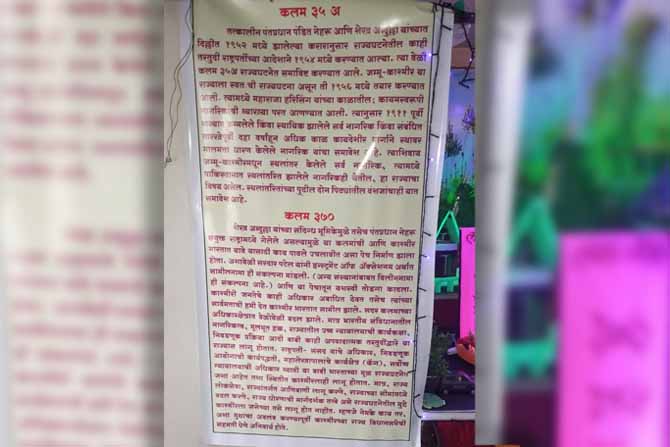 जम्मू-काश्मीरला विशेष दर्जा देणारे कलम ३७० रद्द करण्याच्या सरकारच्या निर्णयाचे स्वागत देशातील प्रत्येक नागरिकाने केले आहे. याच पार्श्वभूमीवर पुण्यातील शनिवार पेठेतील संजय तांबोळी यांनी ‘कलम ३७० हटविल्यानंतरचा भारत’ असा देखावा साकारला आहे. हा देखावा पाहण्यास नागरिकांनी एकच गर्दी केली आहे.