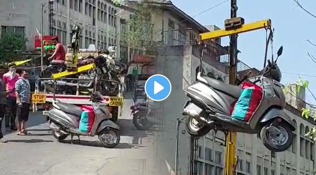 पुण्यातील मुख्य बाजारपेठ म्हणून ओळख असलेल्या लक्ष्मी रोडवर सोमवारी सकाळी ११ वाजता दोघे जण खरेदीसाठी दुचाकीवरून आले होते. यावेळी पार्किंगच्या बाहेर दुचाकी लावून ते खरेदीसाठी गेले होते. तेवढ्यात वाहतूक पोलिसांची गाडी नो पार्किंग किंवा पार्किंगच्या पांढर्या पट्टीबाहेर लावलेल्या गाड्यांवर कारवाई करण्यासाठी आली. यावेळी दुचाकीमध्ये खरेदी केलेले साहित्य ठेवण्यात आलं होतं. पोलिसांनी त्या साहित्यासह क्रेनच्या मदतीने दुचाकी उचलली.