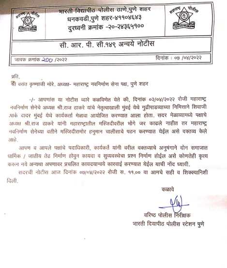 भारती विद्यापीठ पोलीस स्थानकाने मोरे यांना नोटीस पाठवली आहे. या नोटीसमध्ये मोरे यांनी दोन समाजांमध्ये तेढ निर्माण करणारं वक्तव्य केल्याचं सांगत सीआरपीसी १४९ अंतर्गत हीन नोटीस पाठवण्यात येत असल्याचं म्हटलं आहे. भारती विद्यापीठ पोलीस स्थानकातील वरिष्ठ पोलीस निरिक्षकांच्या स्वाक्षरीसहीत ही नोटीस पाठवण्यात आलीय.