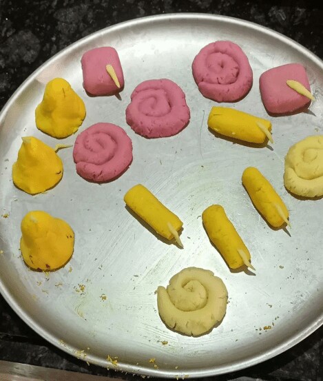 ४. आता पीठाचा छोटा भाग घेऊन त्याला सुरसुरी, चकरी आणि बॉम्बचा आकार द्या.