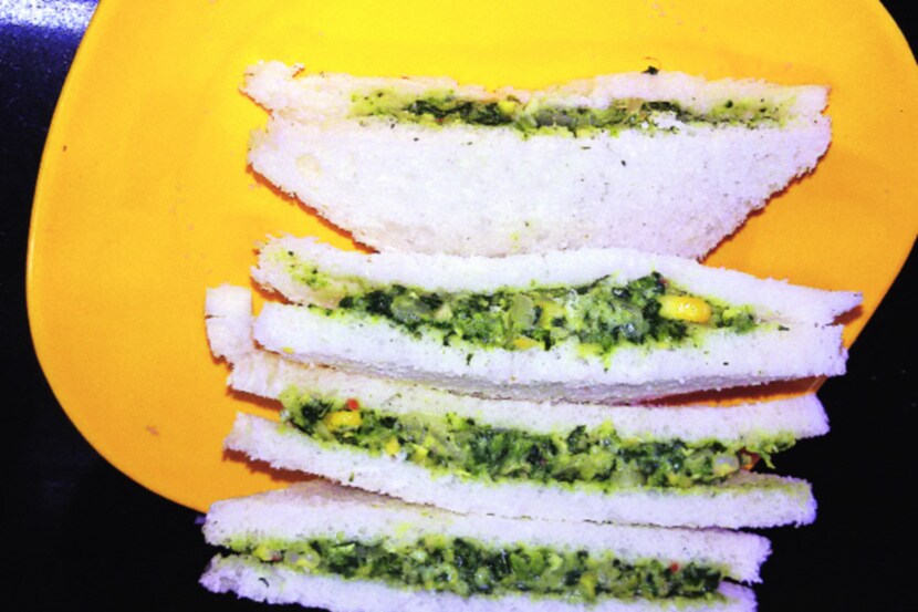 लसूण सोलून बारीक चिरून घ्या. मक्याचे दाणे उकडवून घ्या. जरासे ठेचून घ्या. पालक आणि फ्लॉवरही बारीक चिरून थोडय़ाशा शिजवून घ्या. आता लोण्यावर लसूण परतून घ्या आणि वेगळी काढून ठेवा. पालक, फ्लॉवर आणि मक्याचे दाणे त्याच लोण्यावर परता. हे मिश्रण आचेवरून खाली उतरवा. त्यामध्ये परतलेली लसूण, चीझ, मिरपूड, मीठ हे सगळं व्यवस्थित एकत्र करा. हे मिश्रण ब्रेडमध्ये भरून भाजून घ्या. तुमचं सॅण्डविच तयार आहे.