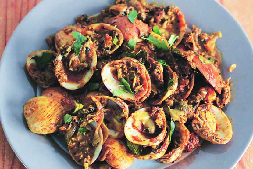 शिंपल्या उकडून त्याचा रिकामा भाग काढून घ्या. नारळ, मिरची, लसूण, कोथिंबीर आणि मीठ घालून वाटून चटणी करा. आता ही चटणी गर असलेल्या शिंपलीवर लावून घ्या. बेसन, हळद, ओवा आणि मीठ एकत्र करून भज्याच्या पिठाप्रमाणे सरसरीत भिजवावे. पॅनमध्ये तेल गरम करून घ्यावे. आता चटणी भरलेल्या शिंपल्या बेसनाच्या या मिश्रणात घोळून शॅलो फ्राय करावे.