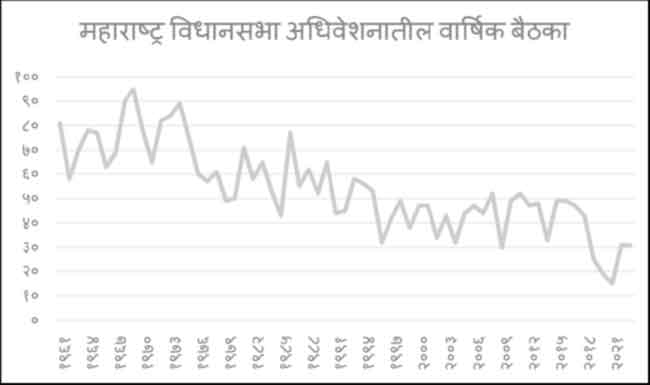 आता एक साधा प्रश्न मनात येतो, की हा आलेख खरं तर उंच जायला नको का? राज्यस्थापनेच्या पहिल्या दशकात जर वर्षांला ७०-८० बैठका होत होत्या तर सध्या हा आकडा दुप्पट-तिप्पट व्हायला पाहिजे! तेव्हा तर दळणवळणाची परिस्थिती अवघड होती. अनेक आमदार एसटीच्या लाल डब्यातून मुंबईला पोहोचत. आता परिस्थिती केवढी बदलली आहे. मोठमोठे महामार्ग झालेले आहेत. आमदारांकडे आलिशान वाहने आहेत. त्यांना विमानाची कुपन्स मिळतात. काहींच्या दिमतीला तर उद्योगपतींची हेलिकॉप्टर्स असतात. शिवाय मुंबई आणि नागपूर येथे अधिवेशनाच्या काळात उत्तम बडदास्त ठेवली जाते. असे असताना बैठकांची संख्या कमी कमी का होते?