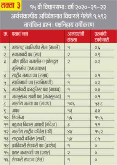 हा अभ्यास आहे, १५ व्या विधानसभा अधिवेशनांतल्या आमदारांच्या कामगिरीचा. मार्च २०२० ते मार्च- एप्रिल २०२२ या काळात, म्हणजेच कोविडसंकटाच्या छायेत महाराष्ट्र विधानसभेची एकूण सात अधिवेशनं झाली. यापैकी धोरणात्मक दृष्टीने महत्त्वाच्या तीन अर्थसंकल्पीय अधिवेशनांची निवड या अभ्यासासाठी केली. या तीनही अधिवेशनांत विचारल्या गेलेल्या सर्व १,५९२ तारांकित प्रश्नांचा कोविडसह अनेक समस्याविषय केंद्रस्थानी ठेवून आम्ही अभ्यास केला. आम्ही एकंदर कामकाजाचा आढावा घेतला असला; तरी मुले, महिला यांसारखे समाजातले दुर्बल घटक आणि मानवविकास निर्देशांक कमी असलेले, म्हणजे इतर जिल्ह्यांच्या तुलनेत मागास असलेले जिल्हे आणि आरोग्य, शिक्षण यांसारखे समाजाच्या विकासासाठी निर्वाणीच्या महत्त्वाचे विषय, यांच्यावर लक्ष केंद्रित केलं आहे. मागील, म्हणजे १४ व्या विधानसभेच्या कार्यकाळातल्या (२०१४-२०१९) अधिवेशनांमध्ये अर्धा तास चर्चा, लक्षवेधी सूचना व तारांकित प्रश्न, अशा तीनही आयुधांद्वारे विचारल्या गेलेल्या एकूण ९,८३५ प्रश्नांचाही आम्ही अभ्यास केला असल्याने तुलनेसाठी आमच्यापाशी विदा (डेटा) तयार आहे. या वेळी, आम्ही १,५९२ तारांकित प्रश्नांचं एकूण ५६ विषय-उपविषय यात वर्गीकरण केलं. हे वर्गीकरण करताना प्रशासकीय विभागही ध्यानात घेतले. यातले काही विषय एकमेकांशी जोडलेले आहेत. तरीही, या वर्गीकरणामुळे प्रश्नांचं, समस्यांचं स्वरूप आणि एकूण कल समजायला मदत झाली.