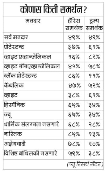 अमेरिकेतील २०२४ च्या अध्यक्षीय निवडणुकीचा प्रचार आता अंतिम टप्प्यात आला आहे. कमला हॅरिस विरुद्ध डोनाल्ड ट्रम्प यांच्या जाहीर वाद-चर्चेनंतर अनिर्णित मतदारांची मते काही अंशी तरी पक्की झाली असतील असा समज करून घेण्यास हरकत नाही. अर्थात गेल्या काही निवडणुका ग्राह्य धरल्या तर अशा चर्चेचा अनिर्णित मतदारांवर फार काही परिणाम होत नाही. अमेरिकेतील मतदार बऱ्याच अंशी अर्थव्यवस्था किंवा स्थलांतराची अनुकूलता, आरोग्यविषयक सेवा अशा मुद्दय़ांचा विचार करून कोणाला मत द्यायचे ते ठरवतो. पुढे त्यात गृहकर्जाचे व्याजदर, महागाई असे अनेक मापदंड असतात. असे असले तरी अमेरिकेतील एकगठ्ठा मते कोणाची असा विचार केल्यास ती निश्चितच मतदारांची धर्माच्या आधारावर विभागणी करूनच तयार होताना दिसतात.