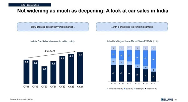 भारत-१ मधील लोकांची संख्या वाढत नसल्याचं महत्त्वाचं निरीक्षण या अहवालात नोंदवलं आहे. उलट, भारत-१, भारत-२ आणि भारत-३ यांमधील तफावत विस्तारते आहे. निराळ्या शब्दांत सांगायचं तर, श्रीमंत आणखी श्रीमंत होत आहेत पण श्रीमंतांची संख्या वाढतं नाही आहे. उदाहरणार्थ, भारतातील चारचाकी गाड्यांची विक्री फारशी वाढलेली नाही. याचा अर्थ, भारतात चारचाकी गाड्या विकत घेणाऱ्या उपभोक्त्यांची कमाल मर्यादा गाठली गेली आहे. त्याचप्रमाणे झोमॅटोवरील सरासरी मासिक सक्रिय वापरकर्त्यांची संख्याही होती तिथेच राहिली आहे, ती अपेक्षेप्रमाणे वाढलेली नाही. देशांतर्गत हवाई वाहतूक करणाऱ्या प्रवासीसंख्येच्या बाबतीतही अशीच कुंठितावस्था दिसून येते. कोव्हिड-१९ साथीच्या आधी होती तितकीच प्रवासीसंख्या आहे. याउलट, एसयूव्ही कार व इतर चैनीच्या वस्तूंची विक्री वाढली आहे. उदाहरणार्थ, किफायतशीर घरांच्या तुलनेत महागड्या घरांची विक्री वाढली. कोव्हिड-१९च्या जागतिक साथीतून भारतीय अर्थव्यवस्था सावरली तरी त्यातील प्रत्येक क्षेत्रासाठी हे सावरणं अत्यंत भिन्न प्रकारचं असेल (K-shaped recovery), ही अनेक अर्थशास्त्रज्ञांनी व्यक्त केलेली भीती प्रत्यक्षात येते आहे.