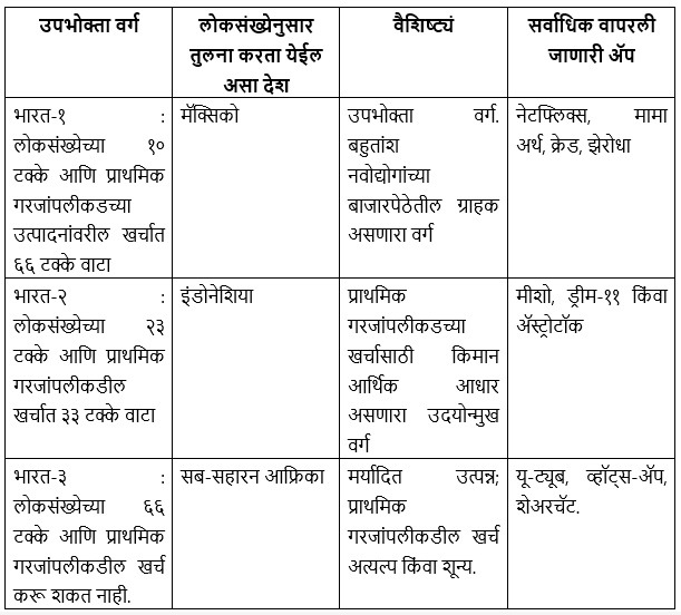 यातील एक मुद्दा नोंदवणं आवश्यक आहे : भारत-२ व भारत-१ या विभागातील लोक भारत-३ मधील ॲपही वापरतात. त्याचप्रमाणे भारत-२ मधील ॲप भारत-१ मधील लोक वापरतात. परंतु, यात उलटा क्रम मात्र दिसत नाही. भारत-२ व भारत-३ या विभागातील लोक भारत-१ मधील ॲप वापरत नाहीत. भारतातील ९० टक्के (सुमारे १०० कोटी) लोकांकडे प्राथमिक गरजांव्यतिरिक्त इतर गोष्टींवर खर्च करण्याची आर्थिक ताकद नाही. केवळ सर्वोच्च स्तरावरील १० टक्के (१३ ते १४ कोटी) लोकच अर्थव्यवस्थेचे व उपभोगाचे प्राथमिक चालक आहेत.