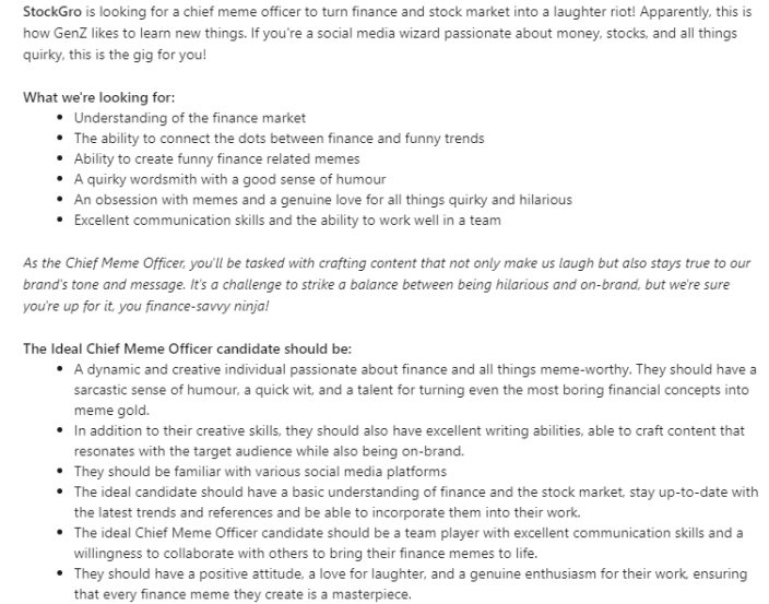 स्टार्टअपने पोस्टमध्ये लिहिले की, ‘चीफ मीम ऑफिसर’ या नात्याने तुम्हाला असा कंटेंट तयार करायचा आहे, ज्यामुळे तुम्हाला फक्त हसायचेच नाही तर ब्रँडचा मेसेजही योग्य प्रकारे पोहोचवता आला पाहिजे. तुम्ही यासाठी तयार असाल तर आम्ही तुमची वाट पाहत आहोत.