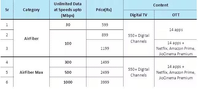 जिओ एअरफायबरचा सर्वात स्वस्त प्लॅन हा ५९९ रुपयांचा आहे. यामध्ये वापरकर्त्यांना ३० mbps चा स्पीड आणि १४ ओटीटी Apps ऑफर करण्यात येतो. तुम्हाला जर का अधिक स्पीड हवा असल्यास तुम्ही ८९९ रुपयांचा प्लॅन घेऊ शकता. यात मिळणारे लाभ हे ५९९ रुपयांच्या प्लानप्रमाणेच आहेत. मात्र स्पीड हा १०० mbps इतका मिळतो. ज्या वापरकर्त्यांना नेटफ्लिक्स, Amazon प्राइम आणि जिओसिनेमा प्रीमियम हवे आहे त्यांच्यासाठी कंपनीने १,१९९ रुपयांचा प्लॅन आणला आहे. ज्यात १०० mbps स्पीड आणि अनलिमिटेड डेटा व ५५० पेक्षा जास्त चॅनेल्सचे फायदे मिळतात.