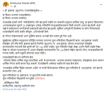आपल्या आंदोलनामुळेच ९२ टक्के मशिदीवरील भोंगे बंद झाले असून मुस्लिमांकडूनही या आंदोलनाचे स्वागत करण्यात आल्याचा दावा ठाकरे यांनी केल्याचा संदर्भ देत शिंदे यांनी फेसबुकवर एक फोटो पोस्ट करत या नव्या ॲपबद्दल सविस्तर माहिती दिली आहे. “राज ठाकरे यांनी “मशिदींवरील भोंगे बंद झाले नाहीत तर त्यासमोर हनुमान चालिसा लावू” हा इशारा दिल्यानंतर आपल्याकडच्या सुमारे ९२ टक्क्यांहून अधिक मशिदींनी लाऊडस्पीकरवरून दिली जाणारी अजान बंद केली. कधी नव्हे ते सर्वसामान्य नागरिकांची सकाळची झोपमोड बंद झाली. मुस्लिम धर्मगुरूंनी घेतलेल्या या योग्य निर्णयासाठी राज ठाकरेंनी त्यांचे जाहीर कौतुक आणि अभिनंदनही केले,” असं पोस्टच्या सुरुवातीला शिंदे यांनी म्हटलं आहे.