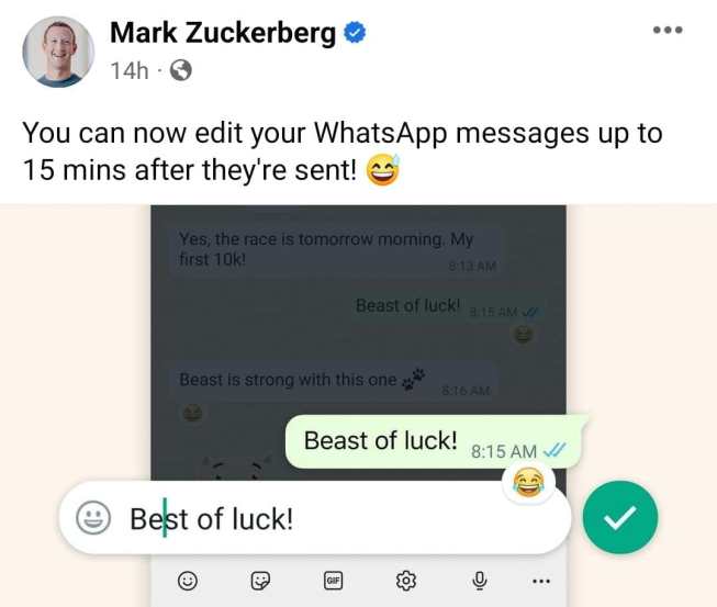 अनेकदा व्हॉट्सअॅप मेसेज पाठवल्यानंतर त्यात चुका असल्याचे आपल्या लक्षात येते. तेव्हा त्यात बदल करणे आवश्यक असते. अशा वेळी व्हॉट्सअॅप एडिट फीचर वापरता येईल. याबाबतची माहिती शेअर करताना मेटाचे प्रमुख मार्क झुकरबर्ग यांनी फेसबुक पोस्ट शेअर केली आहे. या पोस्टमध्ये त्यांनी “आता तुम्ही व्हॉट्सअॅपवर पाठवलेले मेसेज १५ मिनिटांपर्यंत एडिट करु शकता.” हे एडिट फीचर लवकरच जगभरातील यूजर्सना वापरता येणार आहे असे म्हटले जात आहे. सध्या मोजक्या यूजर्सना या सेवाचा लाभ घेता येत आहे.
