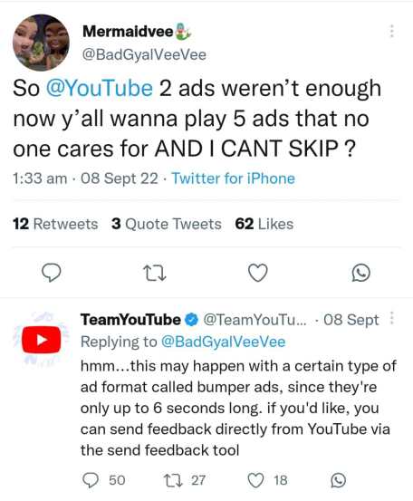 ट्विटरवर जाहिरातीबाबत नाराजी व्यक्त केलेल्या ट्वीटला युट्यूबने रिप्लाय देत स्पष्टीकरण दिले आहे. यावर युट्यूबने ट्वीटमध्ये म्हटले आहे की, ‘विशिष्ट प्रकारच्या जाहिरातीच्या फॉरमॅटबरोबर हे होऊ शकते, ज्याला ‘बंपर ऍड्स’ म्हटले जाते. यातील प्रत्येक जाहिरात केवळ ६ सेकंदाची असणार आहे. म्हणजे एखादा व्हिडीओ सुरू होण्याआधी एकुण जाहिरातींचा वेळ ३० सेकंदाचा असू शकतो. तसेच याबाबत वापरकर्ते ‘सेंड फिडबॅक’ या पर्यायावरून फिडबॅक नोंदवू शकतात.’