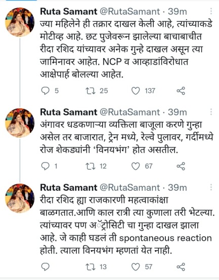 सामाजिक कार्यकर्ता असलेल्या ऋता सामंत-आव्हाड यांनी तीन ट्वीट केले आहेत. पहिल्या ट्वीटमध्ये त्यांनी, “ज्या महिलेने ही तक्रार दाखल केली आहे, त्यांच्याकडे मोटीव्ह आहे. छट पुजेवरून झालेल्या बाचाबाचीत रिदा रशिद यांच्यावर अनेक गुन्हे दाखल असून त्या जामिनावर आहेत,” असं ऋता यांनी म्हटलं आहे. तसेच अन्य एका ट्वीटमध्ये, “राष्ट्रवादी व आव्हाडांविरोधात आक्षेपार्ह बोलल्या प्रकरणी हे गुन्हे रिदाविरोधात दाखल आहेत,” असंही ऋता यांनी सांगितलं.