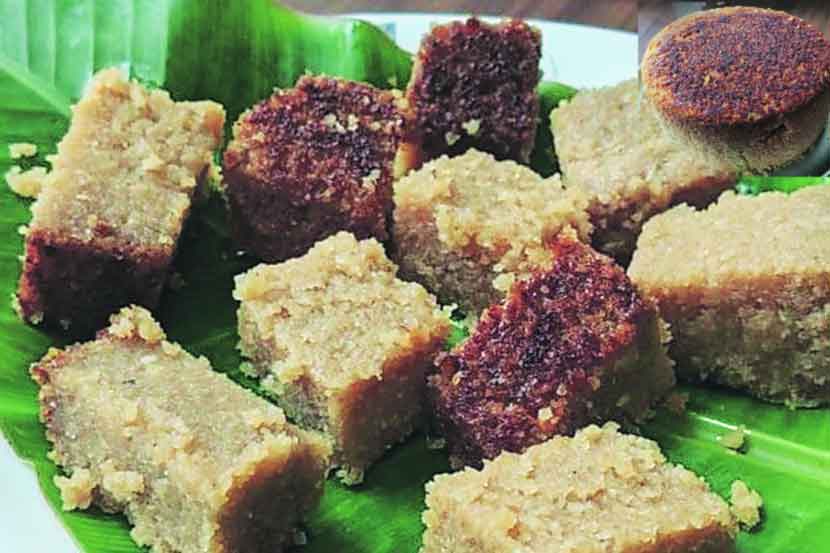 * साहित्य : १ वाटी तांदळाचा रवा, २ वाटी साजूक तूप, २ वाटी गूळ, ३ वाटी नारळाचे दाटसर दूध, १ चमचा वेलची पावडर, १ चमचा जायफळ पावडर, अर्धा चमचा सुंठ पावडर, आवडीनुसार चारोळी आणि काजू-बदामाचे काप, चिमूटभर मीठ.