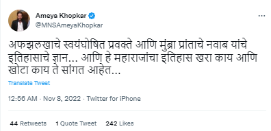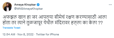 “अफझल खान हा जर आपल्या सीमेचं रक्षण करण्यासाठी आला होता तर त्याने तुळजापूर येथील मंदिरावर हल्ला का केला?” असा प्रश्नही खोपकर यांनी ट्वीटरवरुन विचारला आहे.