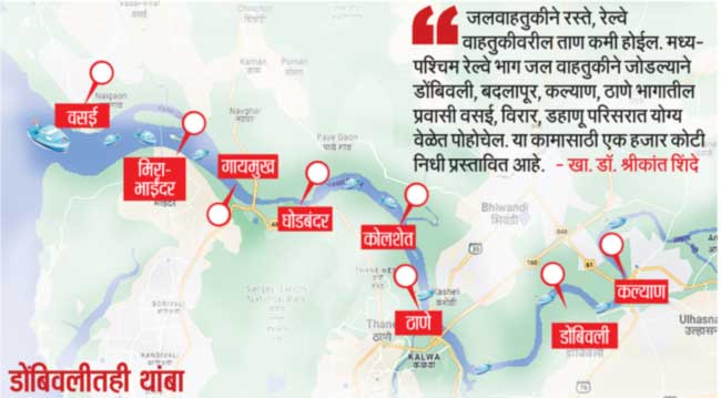 जलवाहतुकीने रस्ते, रेल्वे वाहतुकीवरील ताण कमी होईल. मध्य-पश्चिम रेल्वे भाग जल वाहतुकीने जोडल्याने डोंबिवली, बदलापूर, कल्याण, ठाणे भागातील प्रवासी वसई, विरार, डहाणू परिसरात योग्य वेळेत पोहोचेल. या कामासाठी एक हजार कोटी निधी प्रस्तावित आहे. – खा. डॉ. श्रीकांत शिंदे