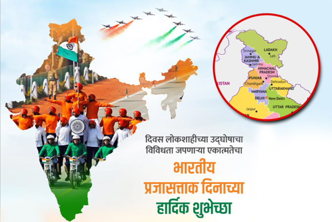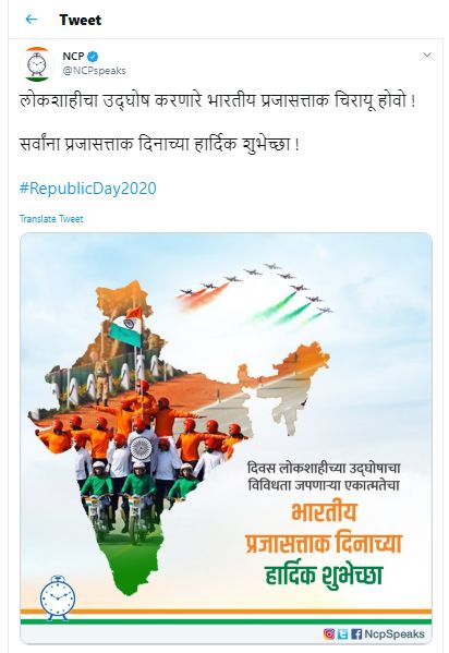 राष्ट्रवादीनं प्रजासत्ताक दिनाच्या शुभेच्छा देताना भारताचा नकाशा पोस्ट केला आहे. ज्यात खांद्यावर तिरंगा घेऊन साहसी कौशल्य दाखवणाऱ्या जवानांचा फोटो आहे. लोकशाहीचा उद्घोष करणारे भारतीय प्रजासत्ताक चिरायू होवो ! सर्वांना प्रजासत्ताक दिनाच्या हार्दिक शुभेच्छा ! असं कॅप्शन देण्यात आलं आहे.