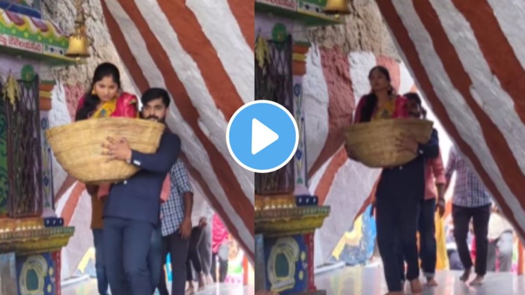 हा व्हायरल व्हिडीओ एका मंदिरातील आहे. मंदिर उंच टेकडीवर आहे आणि ही टेकडी चढण्यासाठी भरपूर पायऱ्या आहेत पण एका तरुणाने बायकोला त्रास होऊ नये म्हणून चक्क तिला टोपलीत बसवले आणि तिला टोपलीत उचलून आणताना या व्हिडीओत दिसत आहे. पुढे तो देवीच्या मुर्तीसमोर बायकोला नेतो आणि प्रेमाने तिला टोपलीच्या बाहेर काढतो. नवऱ्याचं बायकोविषयीचं प्रेम पाहून कुणालाही “नवरा असावा तर असा” असे वाटेल. सध्या या बाहुबली नवरोबाची सोशल मीडियावर जोरदार चर्चा सुरू आहे.