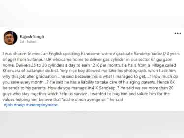 राजेश यांनी पोस्ट मध्ये लिहिले की, गुरुग्रामच्या सेक्टर ६७ मध्ये त्यांच्या घरी गॅस सिलेंडरची डिलिव्हरी करण्यासाठी संदीप यादव नामक एक २४ वर्षीय तरुण आला होता. संदीप हा विज्ञान शाखेतील इंग्रजी भाषेचा पदवीधर आहे. संदीपचे आईवडील वयस्कर असल्याने नोकरी मिळेपर्यंत तो हे सिलेंडर पोहोचवण्याचे काम करत आहे. दिवसाला २५-३० सिलेंडर डिलिव्हरी करून त्याला महिन्याला १२ हजार रुपये मिळतात यातही ८ हजार तो आई वडिलांसाठी गावी पाठवतो व अवघ्या 4 हजारात आपला महिना काढतो. संदीपने सांगितले की तो २० लोकांसोबत राहतो, ज्यामुळे त्याचा खर्च बराच कमी होतो. इतक्या समस्या असतानाही शेवटी जाताना संदीप ‘अच्छे दिन आऐंगे’ असं म्हणून गेल्याचेही राजेश यांनी पोस्टमध्ये लिहिले आहे.
