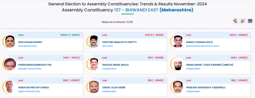 त्यानंतर आम्ही भिवंडी (पूर्व) मतदारसंघाचा निकाल तपासला. निवडणूक आयोगाच्या संकेतस्थळावर दिलेल्या माहितीनुसार, या मतदारसंघातील समाजवादी पक्षाचे उमेदवार रईस कासम शेख यांनी शिवसेने (शिंदे गट)च्या उमेदवाराचा ६७,६७२ मतांनी पराभव केला.