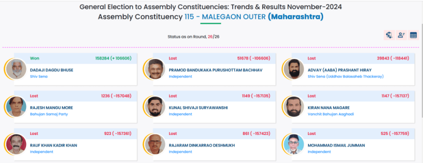 त्याच वेळी, मालेगाव लोकसभा मतदारसंघात शिवसेनेचे उमेदवार दादाजी दगडू भुसे (शिंदे गट) यांनी अपक्ष उमेदवार प्रमोद बंडुकाका पुरुषोत्तम बच्छाव यांचा १,०६,६०६ मतांनी पराभव केला. या मतदारसंघात शिवसेना (उद्धव गट) आणि बहुजन समाज पक्ष तिसऱ्या आणि चौथ्या क्रमांकावर राहिले. या मतदारसंघातून एआयएमआयएमचा एकही उमेदवार रिंगणात नव्हता.