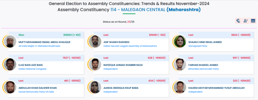 तिसरा दावा मालेगाव संदर्भात करण्यात आला होता. मालेगाव सेंट्रल विधानसभा मतदारसंघातील एआयएमआयएमचे उमेदवार मुफ्ती मोहम्मद इस्माइल अब्दुल खलीक यांनी प्रतिस्पर्धी आसिफ शेख रशीद (इंडियन सेक्युलर लार्जेस्ट असेम्ब्ली ऑफ महाराष्ट्र) यांचा १६२ मतांनी पराभव केला.