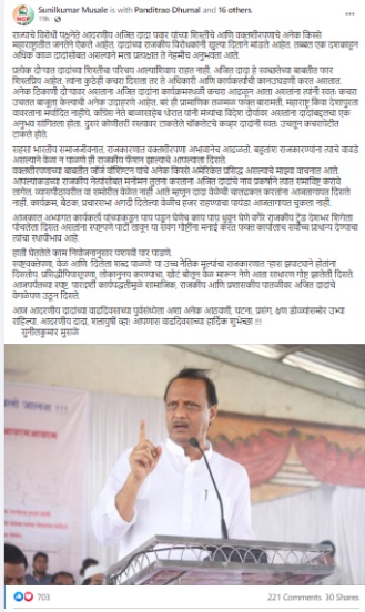 राष्ट्रवादी काँग्रेसचे नेते आणि राज्याचे विद्यमान विरोधी पक्षनेते अजित पवार यांचा आज वाढदिवस. अजित पवार हे आज आपला ६३ वा वाढदिवस साजरा करत आहेत. अनेक नेतेमंडळी आणि कार्यकर्त्यांकडून त्यांच्यावर शुभेच्छांचा वर्षाव होत असतानाच एका खास व्यक्तीने अजित पवार यांना फेसबुक पोस्टमधून शुभेच्छा दिल्या आहेत. अजित पवारांच्या राजकीय कारकिर्दीमधील अनेक गोष्टी अगदी जवळून पाहणारे त्यांचे स्वीय सहाय्यक सुनीलकुमार मुसळे यांनी फेसबुकवरुन अजित पवार यांना खास शुभेच्छा दिल्यात.