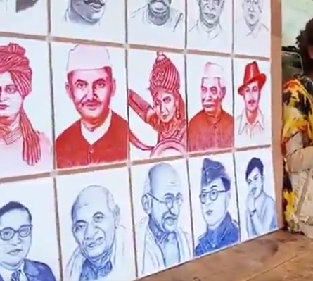 व्हिडीओमध्ये ही मुलगी एका मोठ्या टेबलवर प्रत्येकी पाच चित्रं एका ओळीत अशापद्धतीने मांडणी करुन लाकडी पट्ट्यांना पेन बांधून चित्रं साकारताना दिसत आहे. हा व्हिडीओ फास्ट फॉरवर्डमध्ये आहे. त्यामुळे ती अवघ्या काही सेकंदांमध्ये एकाच वेळी १५ महापुरुषांचं चित्रं पूर्ण करताना दिसते.