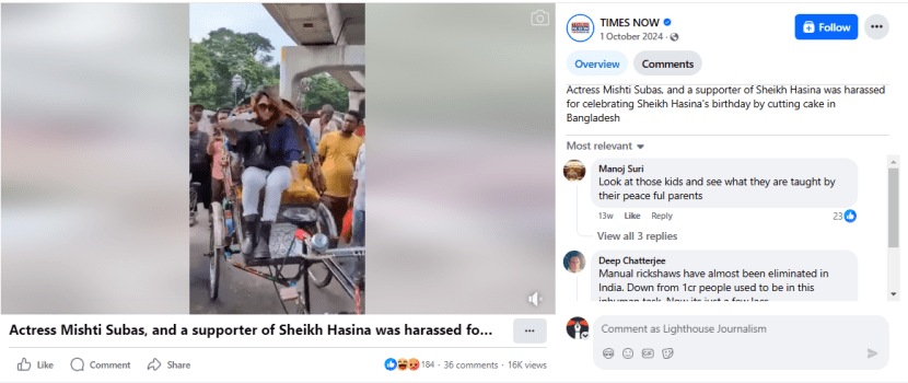 त्या व्हिडीओच्या कॅप्शनमध्ये म्हटले आहे की (भाषांतर) : अभिनेत्री मिष्टी सुबास आणि शेख हसीना यांच्या समर्थकाने बांगलादेशमध्ये शेख हसीना यांचा वाढदिवस केक कापून साजरा केल्याने लोकांनी त्यांना त्रास देण्यास सुरुवात केली.