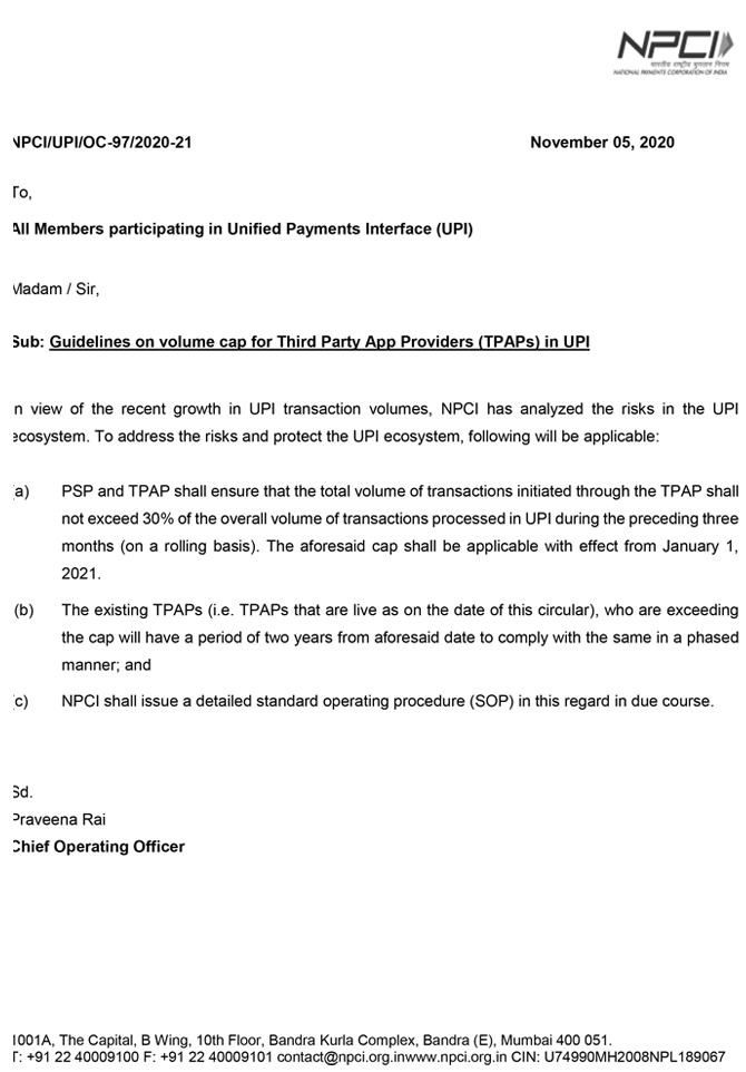 या निर्णयाबाबत NPCIने सांगितले की, सध्या UPI वरून पैसे पाठवणाऱ्यांची संख्या महिन्याला सुमारे २०० कोटी इतकी आहे. थर्ड पार्टी अॅप प्रोव्हायडर्सवर ३० टक्के कॅप लावण्याचा निर्णय घेण्यात आला आहे. भविष्यात कुठल्याही थर्ड पार्टी अॅपची मक्तेदारी रोखण्यासाठी आणि निकोप स्पर्धेसाठी NPCIने हा निर्णय घेतला आहे. NPCIच्या या निर्णयामुळे आता UPI ट्रान्झॅक्शनमध्ये कोणत्याही एकाच अॅपची मक्तेदारी न राहणार नाही. तसेच, गुगल पे, अॅमेझॉन पे, फोन पे यांसारख्या कंपन्या आता UPIअंतर्गत होणाऱ्या एकूण ट्रान्झॅक्शनमध्ये जास्तीत जास्त ३० टक्के ट्रान्झॅक्शनचीच तरतूद करू शकतील.