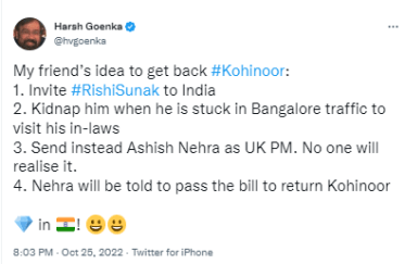सुनक हे भारतीय वंशाचे असून त्यांची पत्नी अक्षता या ‘इन्फोसिस’चे सह-संस्थापक नारायण मूर्तींच्या कन्या आहेत. कॅलिफोर्नियातील ‘एमबीए’साठी स्टॅनफोर्ड येथे असताना इन्फोसिसचे सहसंस्थापक नारायण मूर्ती यांची मुलगी अक्षता यांच्याशी त्यांचा परिचय झाला. त्यानंतर २००९ मध्ये सुनक यांनी अक्षतासोबत विवाह केला. सुनक यांच्या सासरवाडीच्या याच कनेक्शनचा अप्रत्यक्ष संदर्भ गोयंका यांनी दुसऱ्या मुद्द्यात दिला आहे. बंगळुरुमधील वाहतूक कोंडी हा इंटरनेटवर कायमच चर्चेचा विषय असतो. तर सुनक यांच्याप्रमाणे चेहऱ्याची ठेवण असणारा भारताचा माजी वेगवान गोलंदाज आशिष नेहराही ब्रिटनमधील या राजकीय घडामोडींच्या पार्श्वभूमीवर चर्चेत आहे. त्याची सांगडही गोयंका यांनी तिसऱ्या आणि चौथ्या मुद्द्यात घातली आहे.