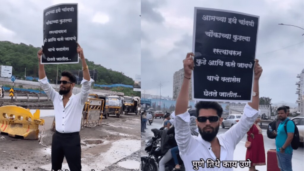 चांदणी चौक आणि वाहतूक कोंडी हे समीकरणच झालं आहे. चांदणी चौकात आले की कोणत्या रस्त्याने जावे हा प्रश्न पडत असतो याचे उत्तर देणारा एक मजेशीर व्हिडीओ सध्या व्हायरल होत आहे. या व्हिडीओमध्ये एक तरुण चांदणी चौकात एक फलक घेऊन उभा असलेला दिसत आहे. तरुणाच्या हातातील फलक वाचण्यासाठी लोक आवर्जून थांबत आहे आणि हसत हसत पुढे जाताना दिसत आहे. तरुणाच्या हातातील फलकावर लिहिले आहे की, ”आमच्या इथे चांदणी चौकाच्या कुठल्या रस्त्यावरून कुठे आणि कसे जायचे याचे क्लासेस घेतले जातील.”