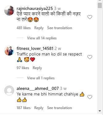 व्हिडीओ व्हायरल होताच अनेकांनी यावर आपल्या प्रतिक्रिया दिल्या आहेत. एका युजरनं कमेंट करीत लिहिलं, “अशा प्रकारे प्रेम करणाऱ्यांना कोणाचीही नजर लागू नये.” तर दुसऱ्यानं कमेंट केली, “ट्रॅफिक पोलिसांना खूप रिस्पेक्ट.” तर एक जण कमेंट करीत म्हणाला, “असं प्रेम करायलाही हिंमत लागते.” “तुम्ही निर्लज्ज माणसासारखे चारचौघांत तुमच्या आई-वडिलांच्या इज्जतीचा लिलाव करीत आहात,” अशीही कमेंट एकानं केली.