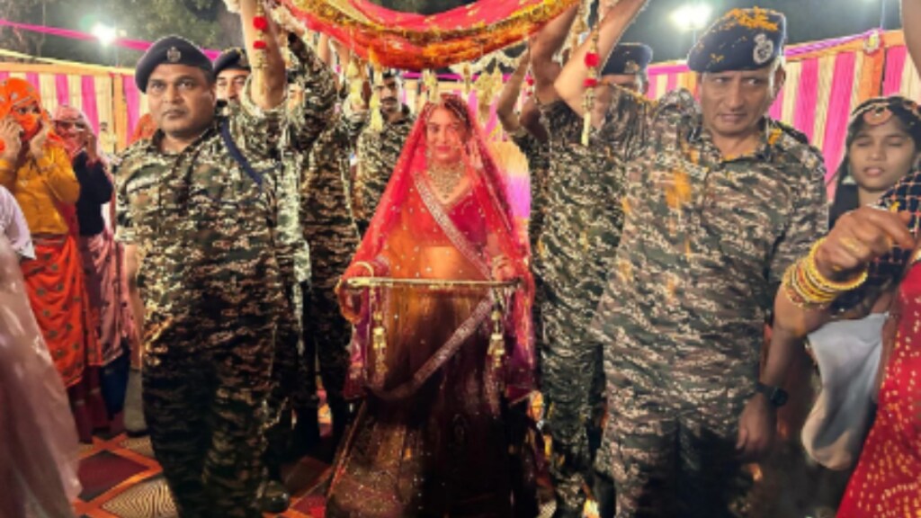 एका हृदयस्पर्शी विवाह सोहळ्यात केंद्रीय राखीव पोलीस दलाच्या (CRPF) जवानांनी राजस्थानच्या अलवरमध्ये एका शहीद सैनिकाच्या मुलीच्या लग्नात भावाचे कर्तव्य पार पाडले. लग्नाचे फोटो इंडियन मिलिटरी अपडेट्स या नावाने जाणाऱ्या इन्स्टाग्राम पेजवर शेअर करण्यात आले आहेत. पोस्टच्या कॅप्शनमध्ये वधूचे नाव सारिका मीना असल्याचे सांगितले आहे. सारीका ही दिवंगत सीआरपीएफ कॉन्स्टेबल राकेश कुमार मीना यांची मुलगी आहे. दुबी गावात दिवंगत राकेश कुमार मीना यांच्या घरी हा सोहळा पार पडला.